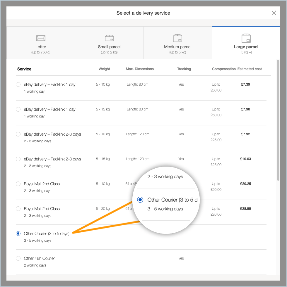 You will now be shown a pop-up where you can choose from numerous options. To give your customers a clear delivery rate go to the fourth tab which says ‘Large Parcel’.