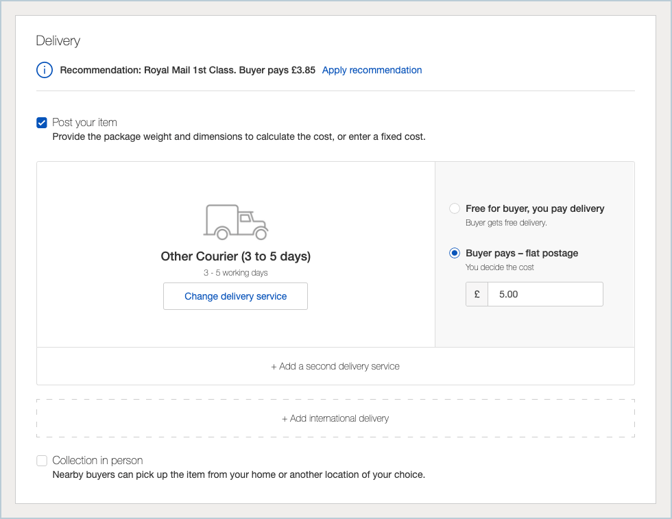 Once chosen you can now set your postage rate in the section to the right. Select ‘Buyer pays’ and enter the amount you want your customer to pay for postage.
